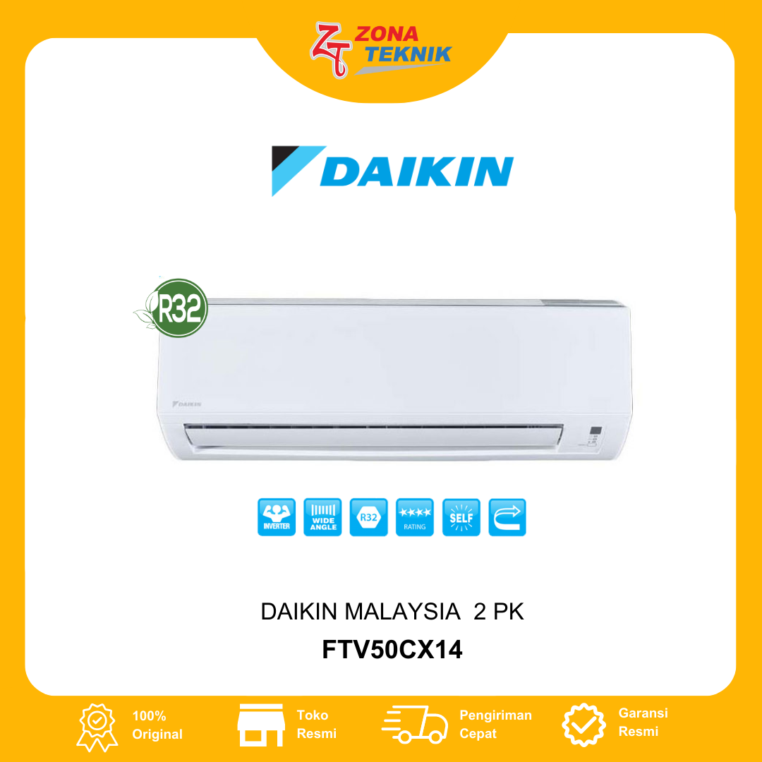 DAIKIN MALAYSIA FTV50cX14 2 PK – Daikin adalah merk pendingin ruangan yang dimana merk ini telah dipakai oleh ribuan rumah tangga di seluruh dunia. Desainya sangat stylish, canggih, dan bergaya sangat cocok ditempatkan diberbagai ruangan dengan efisiensi yang tinggi. Daikin juga dilangkapi dengan High Quality Clean Air dan Air Purifying Filter yang berfungsi untuk membunuh bakteri dan virus, juga mencegah ruangan menjadi bau.